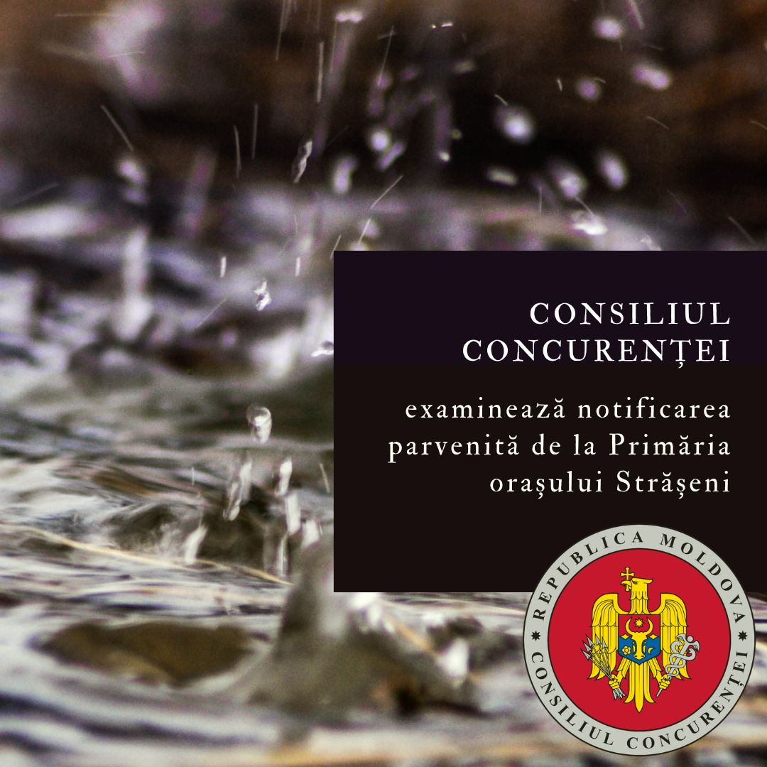 Consiliul Concurenței examinează notificarea parvenită de la Primăria orașului Strășeni, ce constă în transmiterea în gestiune economică cu titlu gratuit a mijloacelor fixe: rețelele de canalizare și stațiile de pompare, în scopul prestării serviciului de interes economic general.