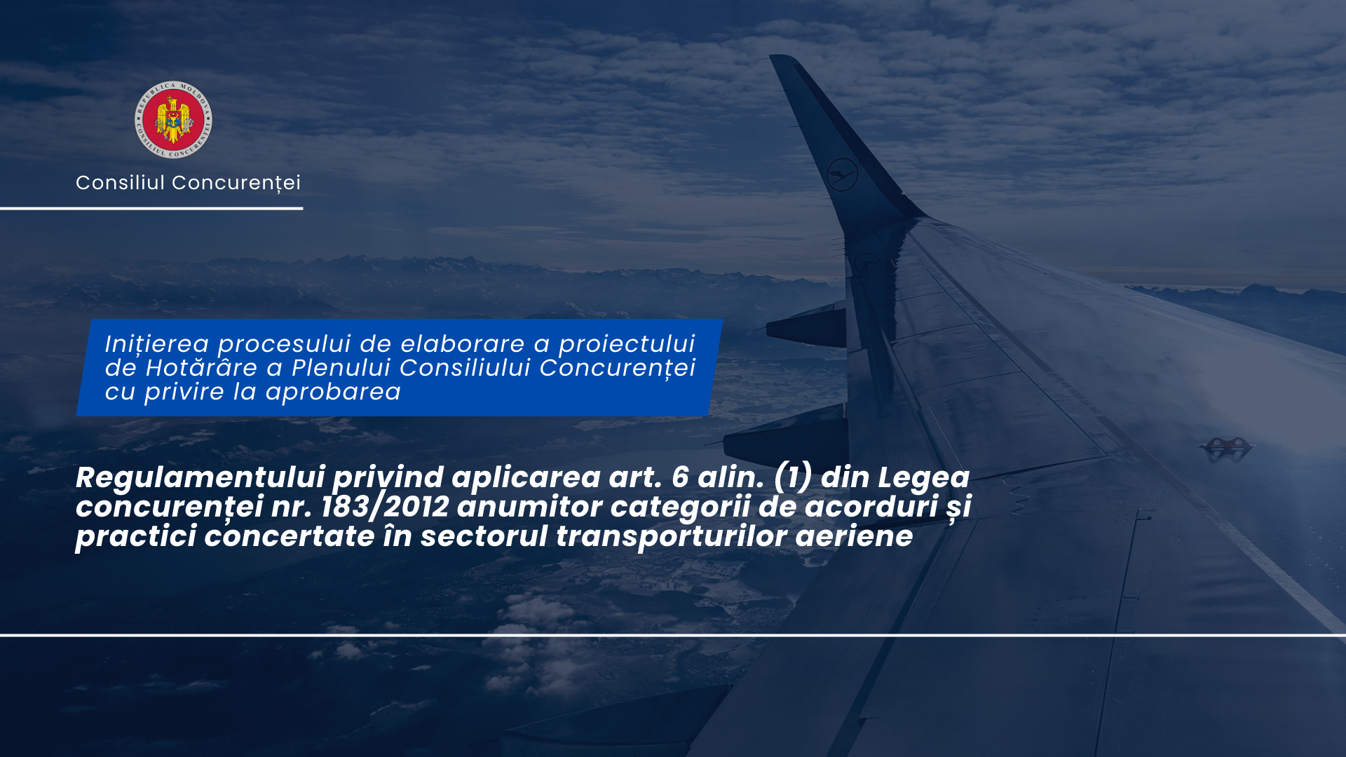 Consiliul Concurenței, în conformitate cu art. 9 din Legea nr. 239/2008 privind transparența în procesul decizional și art. 20 alin. (1) lit. a) din Legea nr. 100/2017 cu privire la actele normative, anunță despre inițierea procesului de elaborare a proiectului de Hotărâre a Plenului Consiliului Concurenței cu privire la aprobarea Regulamentului privind aplicarea art. 6 alin. (1) din Legea concurenței nr. 183/2012 anumitor categorii de acorduri și practici concertate în sectorul transporturilor aeriene al Consiliului Concurenței, care va asigura transpunerea Regulamentului (CE) nr. 487/2009 al Consiliului privind aplicarea articolului 81 alineatul (3) din tratat anumitor categorii de acorduri și practici concertate în sectorul transporturilor aeriene.