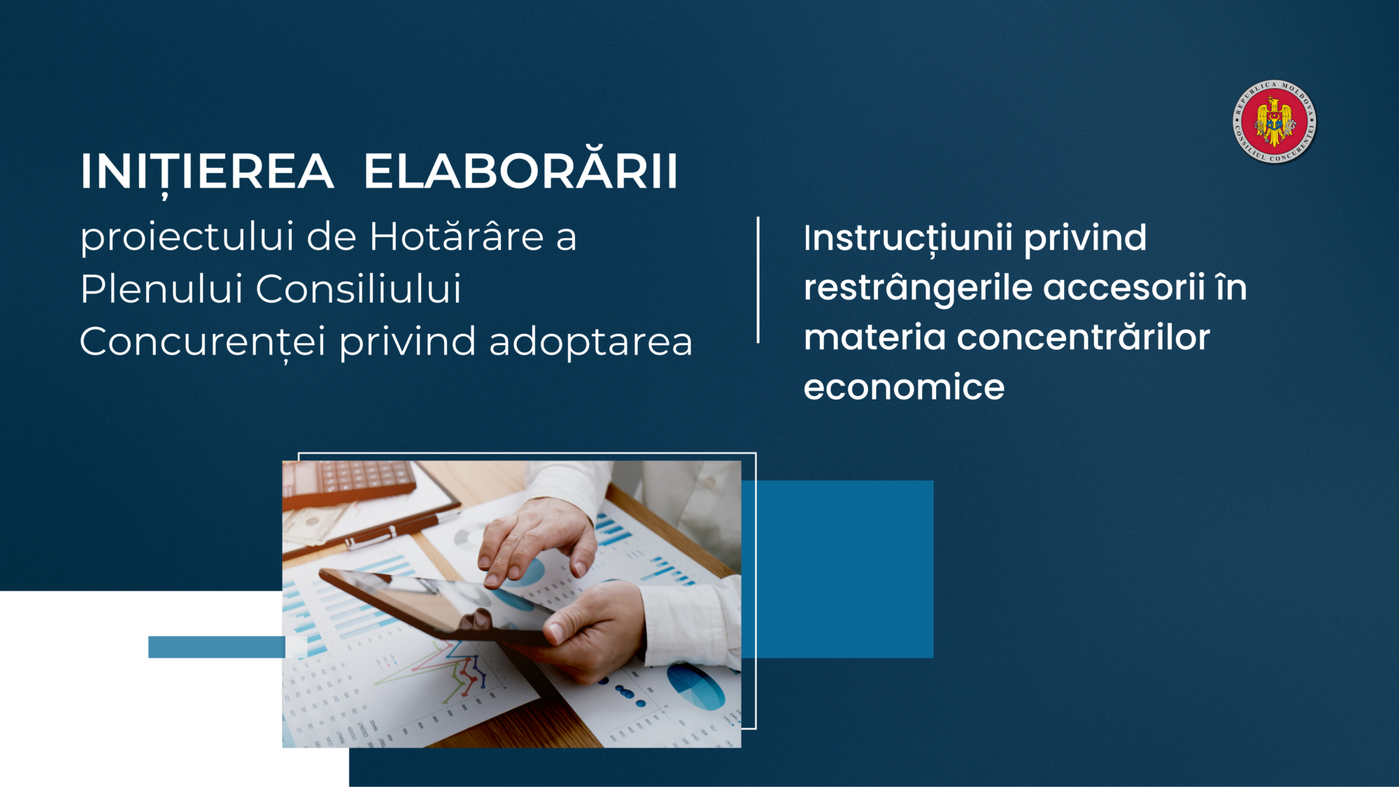 Consiliul Concurenței, în conformitate cu prevederile art. 9 din Legea nr. 239/2008 privind transparența în procesul decizional și art. 20 alin. (1) lit. a) din Legea nr. 100/2017 cu privire la actele normative, anunță despre inițierea procesului de elaborare a proiectului de Hotărâre a Plenului Consiliului Concurenței cu privire la aprobarea Instrucțiunii privind restrângerile accesorii în materia concentrărilor economice.