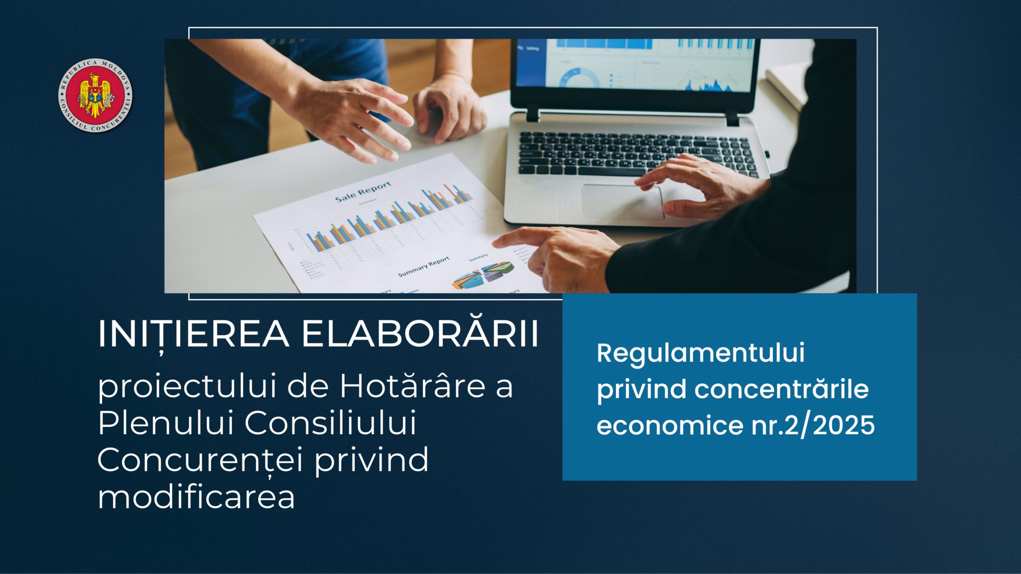 Consiliul Concurenței, în conformitate cu prevederile art. 9 din Legea nr. 239/2008 privind transparența în procesul decizional și art. 20 alin. (1) lit. a) din Legea nr. 100/2017 cu privire la actele normative, anunță despre inițierea procesului de elaborare a proiectului de Hotărâre a Plenului Consiliului Concurenței cu privire la modificarea Regulamentului privind concentrările economice nr. 2/2025.