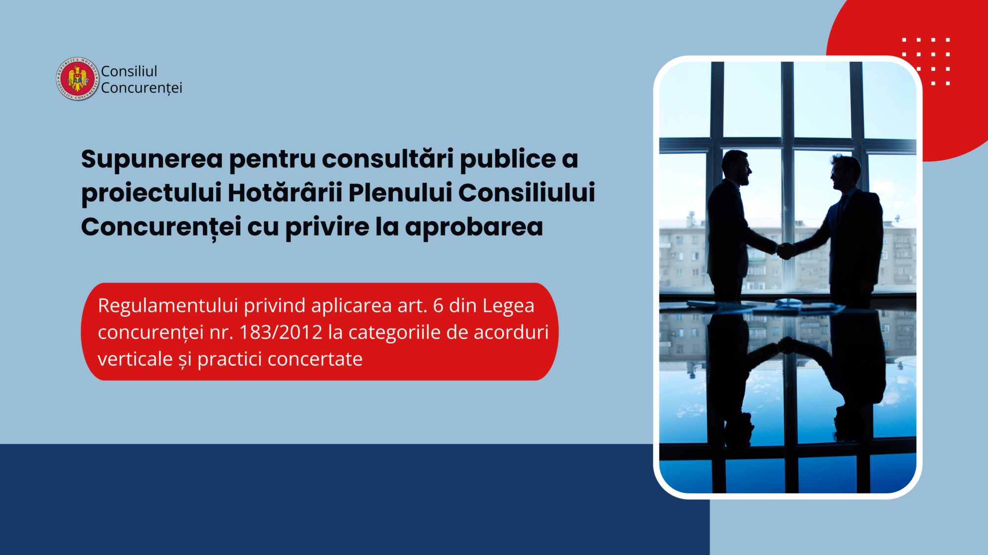 În temeiul art. 32 alin. (5) din Legea nr. 100/2017 cu privire la actele normative, se supune consultărilor publice proiectul Hotărârii Plenului Consiliului Concurenței cu privire la aprobarea Regulamentului privind aplicarea art. 6 din Legea concurenței nr. 183/2012 la categoriile de acorduri verticale și practici concertate.