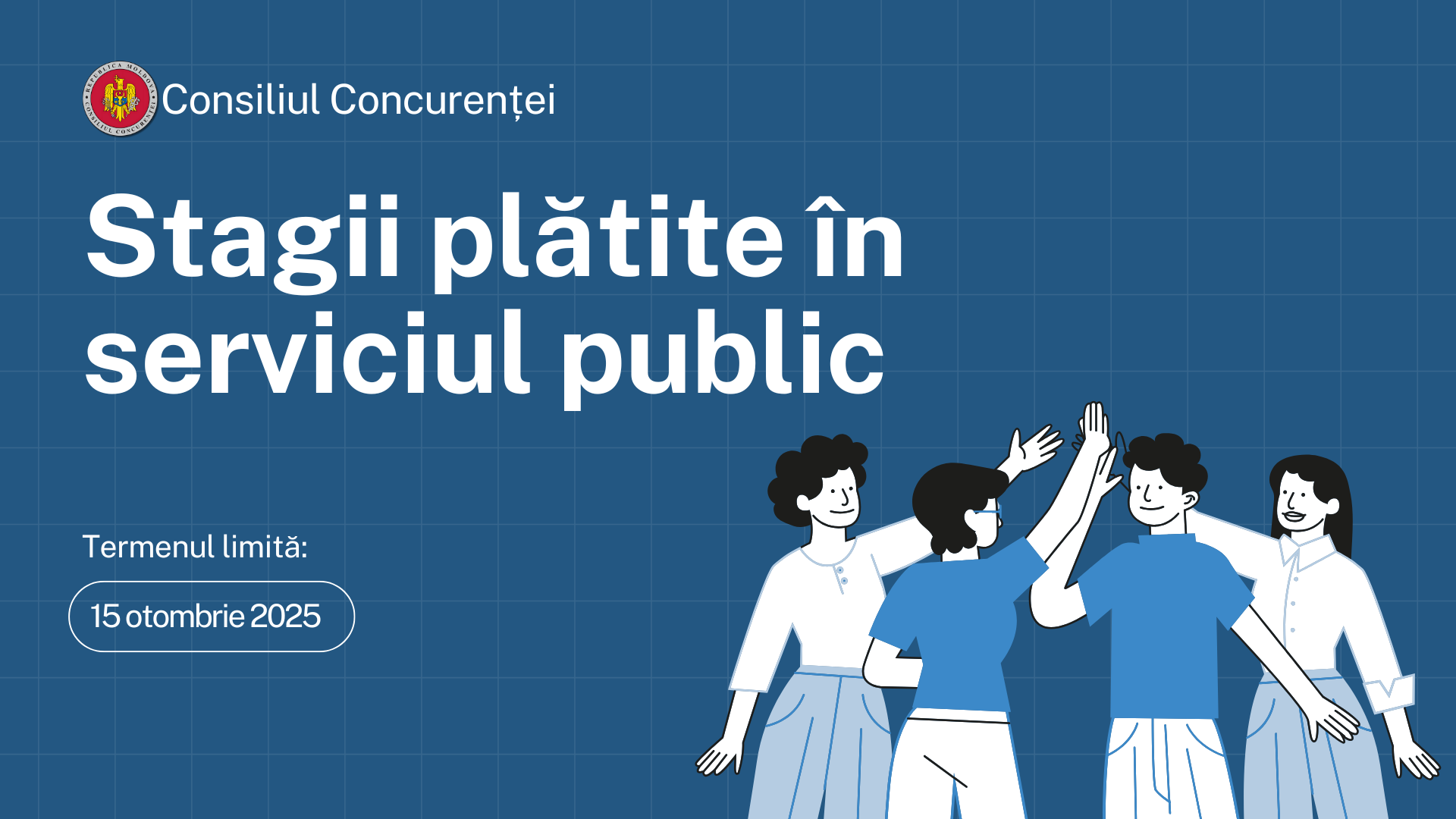 Consiliul Concurenței invită studenții și absolvenții instituțiilor de învățământ din Republica Moldova să aplice la Programul de stagii plătite în serviciul public, ediția 2025. Programul este implementat de Cancelaria de Stat și are drept scop implicarea tinerilor în activitatea autorităților publice, oferindu-le oportunitatea de a dobândi experiență practică și cunoștințe relevante pentru o eventuală carieră în sectorul public.